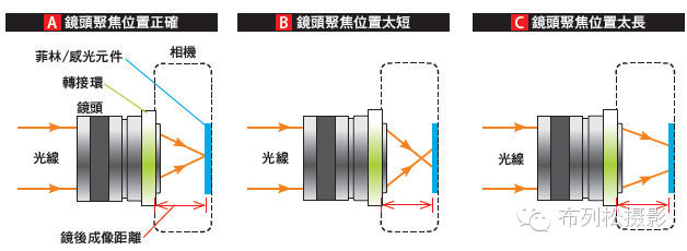 C:镜头聚焦位置比镜后成像距离长,光线于抵达焦平面之时还未聚焦, 可透过加厚转接环纠正。